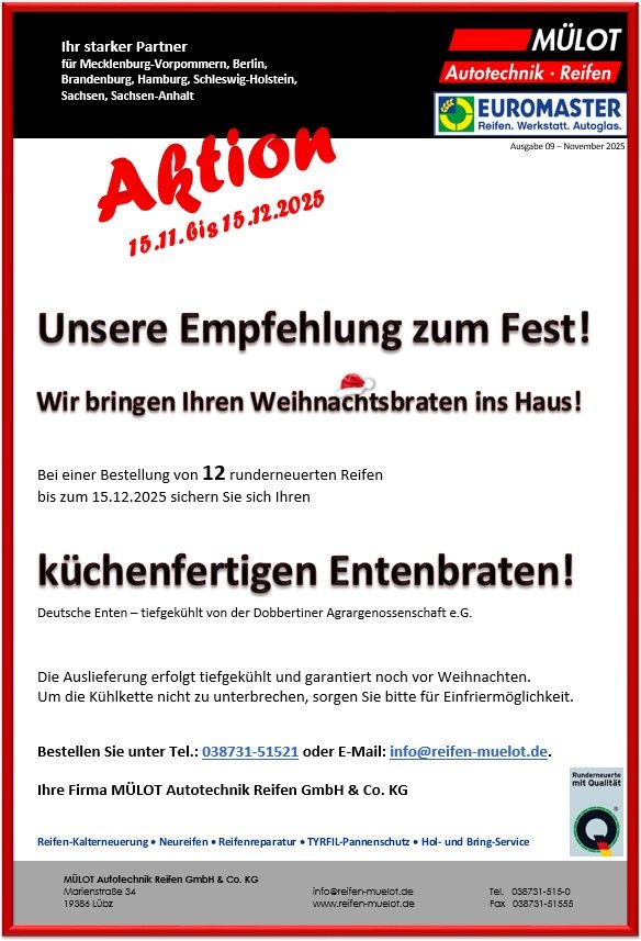 Auch in diesem Jahr haben wir wieder ein besonderes Angebot für unsere Kunden! Bei einer Bestellung von 12 runderneuerten Reifen erhalten Sie bis zum 15.12.2025 einen küchenfertigen Entenbraten - direkt zu Ihnen nach Hause geliefert.